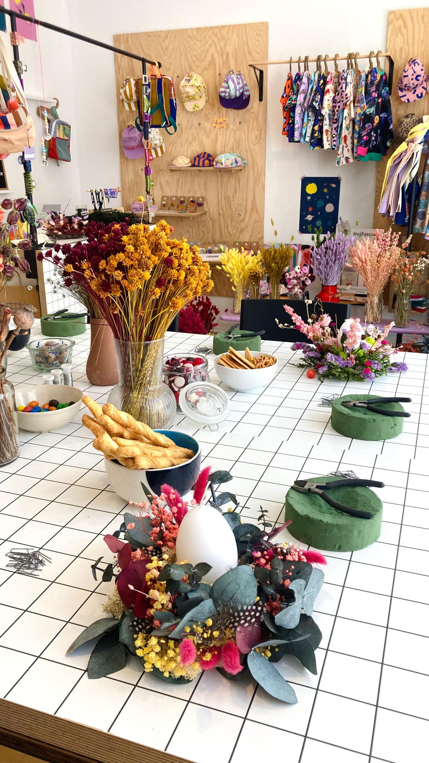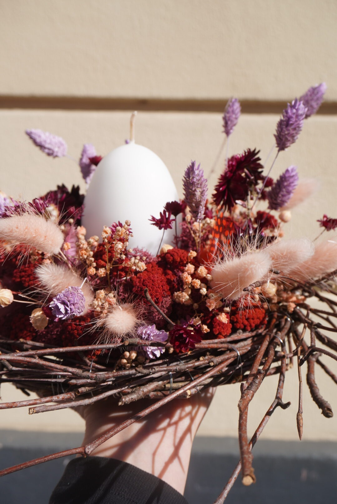 Mit unterschiedlich farbigen Moosen und einer großen Auswahl an bunten Trockenblumen kannst du dein Nest ganz nach deinem Geschmack stecken. Wer mag, kann zusätzlich künstliche Eier und Federn verwenden für die zusätzliche Osternote. Und damit du dein Werk nicht leer nach Hause nimmst, erhält jede Teilnehmer*in eine mittelgroße Eierkerze, die das Nest perfekt ergänzt. (Auf den Fotos nicht abgebildet)